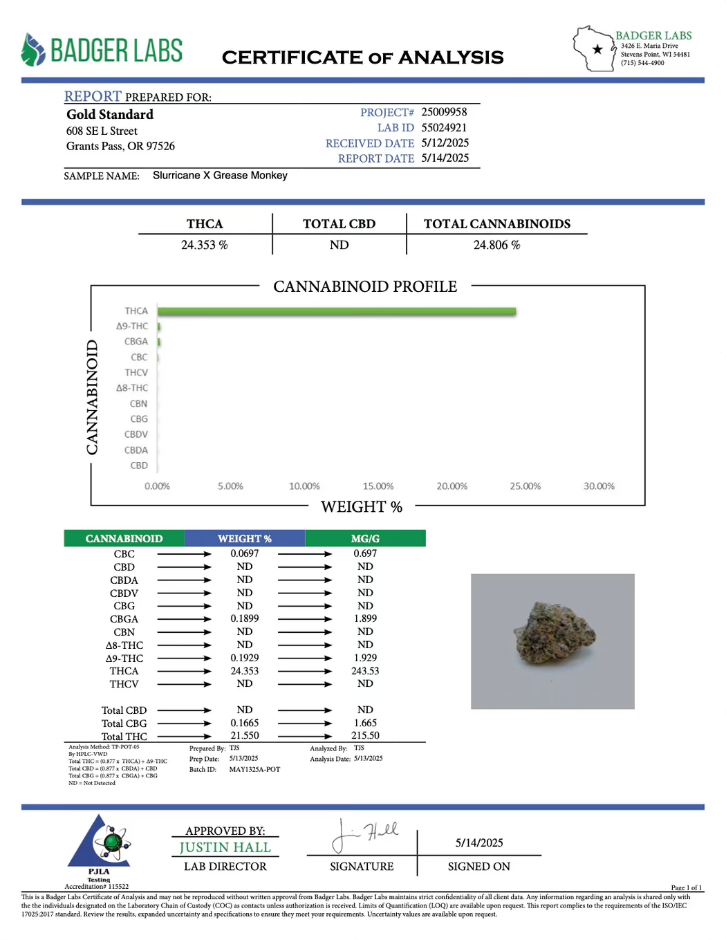 Slurricane x Grease Monkey is a powerful indica-dominant hybrid that blends fruity, tropical flavors with earthy, diesel notes. Known for its deeply relaxing effects, this strain is ideal for unwinding after a long day, soothing the body, and easing into restful tranquility.